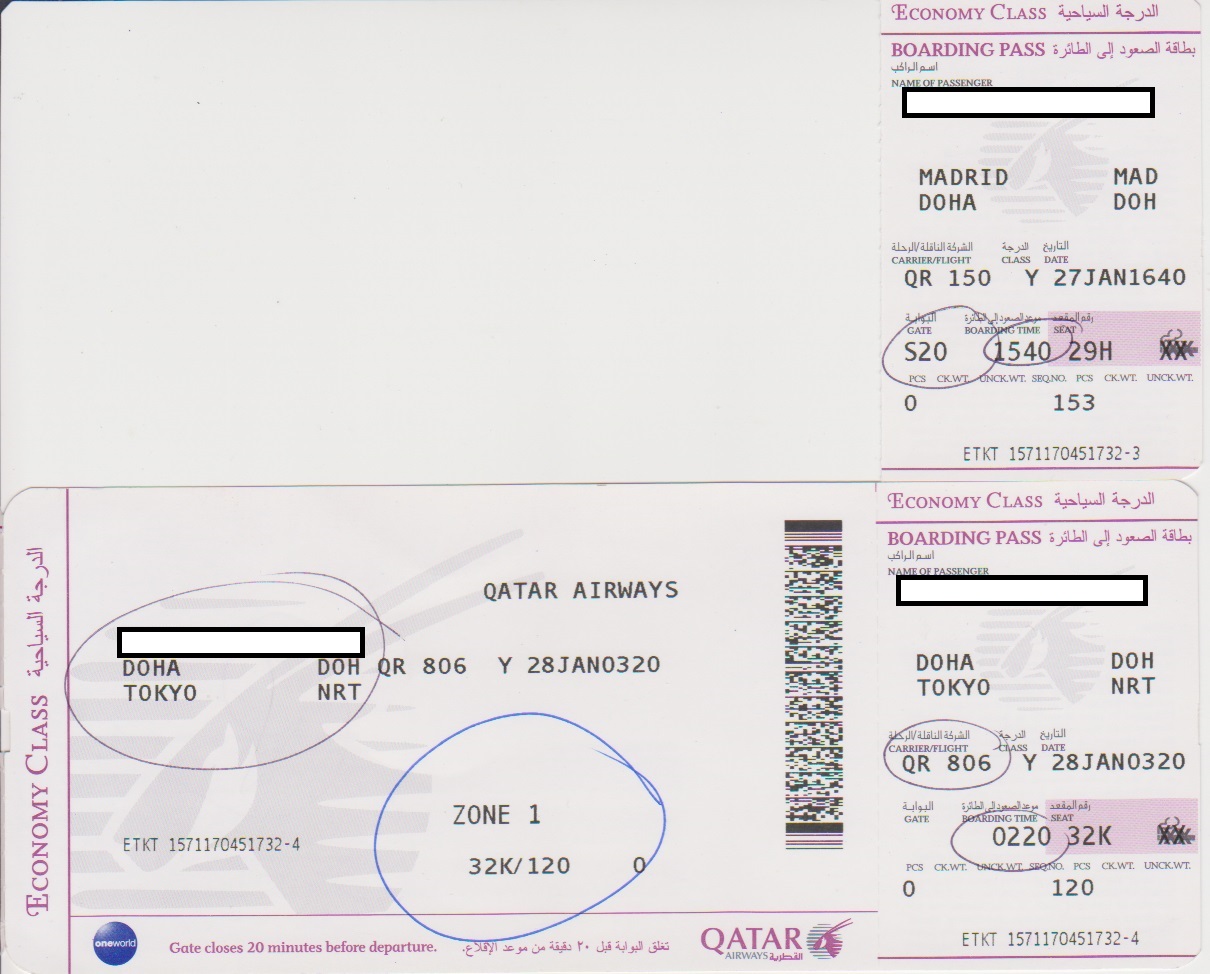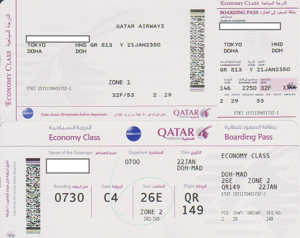 1/28(土) ドーハ 1:00 QR806 ドーハ3:20 東京(成田)19:00 カタール航空